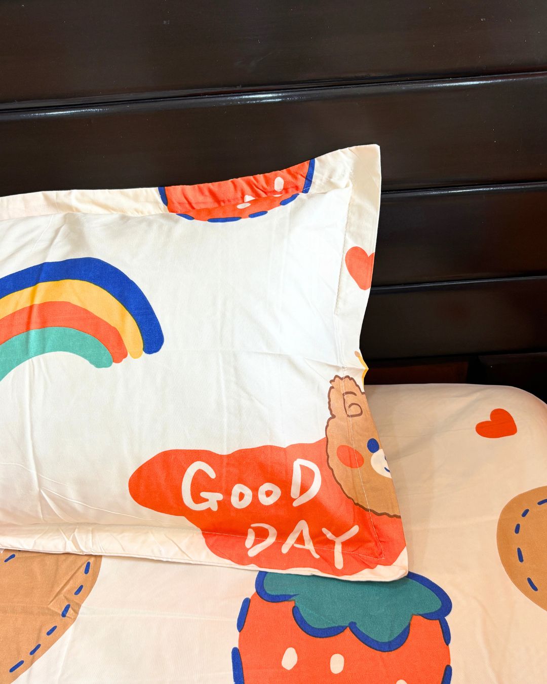Brighten up your child’s room with this cheerful and heartwarming bedsheet from Home Saarthi. Set on a soft cream base, the design features adorable character illustrations, playful “Good Day” text, colorful rainbows, flowers, strawberries, and tiny hearts scattered across the surface. The vibrant mix of orange, red, blue, yellow, and green tones creates a joyful and lively atmosphere that instantly uplifts the space.